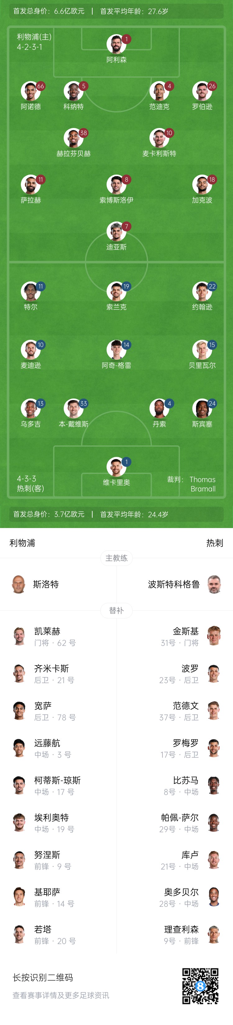 利物浦首发:1-阿利森、4-范迪克、5-科纳特、26-罗伯逊、66-阿诺德、8-索博斯洛伊、10-麦卡利斯特、38-赫拉芬贝赫、7-路易斯-迪亚斯、11-萨拉赫、18-加克波