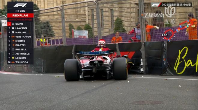 Q3起表后开始下雨,勒克莱尔打滑上墙,这次他没有延续自己在巴库的优秀表现,还引发了红旗,观众席车迷的标牌亮了。