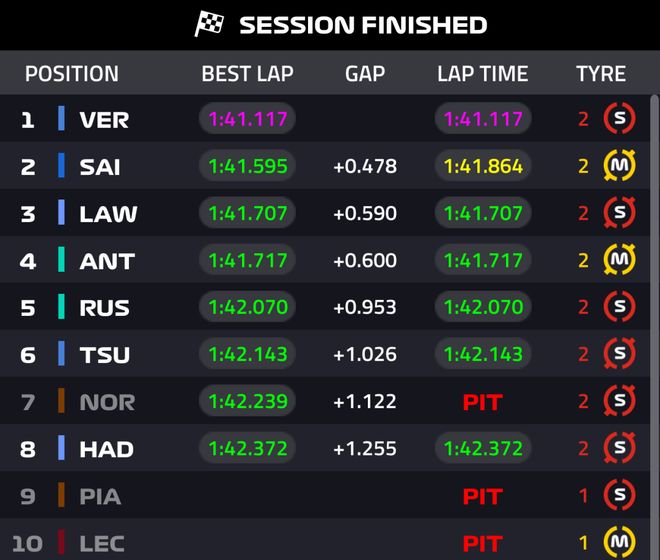又又又又又又一次比赛恢复,Q3还剩最后3分半的时间,场地还略显湿滑,诺里斯第一个出场但多次打滑没有跑好,维斯塔潘凭借出色的发挥冲到第一!塞恩斯则凭借干地时候跑出的1:41.595同样头排发车!劳森第三,安东内利第四,拉塞尔第五,角田第六,诺里斯仅仅排在第七,哈贾尔第八,皮亚斯特里和勒克莱尔在第九和第十位。