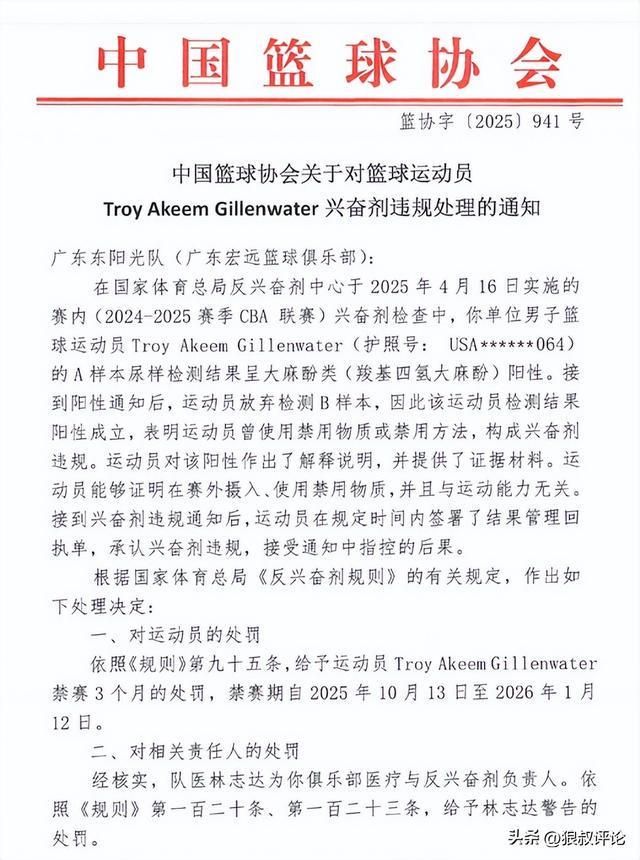 北京时间10月13日,中国篮球协会对兴奋剂违规的中国男子篮球职业联赛(CBA)外援吉伦沃特处以禁赛3个月的处罚,广东宏远篮球俱乐部作为管理单位受到了警告及负担20例兴奋剂检测费用(人民币36000元)的处罚,该单位的医疗与反兴奋剂负责人、队医林志达被给予警告处罚。 在国家体育总局反兴奋剂中心于2025年4月16日实施的赛内兴奋剂检查中,你单位男子篮球运动员吉伦沃特的A样本尿样检测结果呈大麻酚类(羧基四氢大麻酚)阳性。接到阳性通知后,运动员放弃检测B样本,因此该运动员检测结果阳性成立,表明运动员曾使用禁用物质或禁用方法,构成兴奋剂违规。运动员对该阳性作出了解释说明,并提供了证据材料。运动员能够证明在赛外摄入、使用禁用物质,并且与运动能力无关。接到兴奋剂违规通知后,运动员在规定时间内签署了结果管理回执单,承认兴奋剂违规,接受通知中指控的后果。吉伦沃特和哈雷尔的大麻酚阳性事件是同时期出现,但是哈雷尔对其大麻酚阳性结果给出的相关证据还在核实过程中。因此,中国篮协先公布了对吉伦沃特的处罚决定,对哈雷尔的处罚决定将另行公布。 吉伦沃特目前已经是确定加盟中国台北联赛的富邦勇士,而目前已经证实非比赛期间违规使用兴奋剂,是否会受到追加的停赛的处罚相信是外界关注的焦点。吉伦沃特兴奋剂违规也是CBA历史上第三例兴奋剂处罚案例 2012年12月9日,国家体育总局反兴奋剂中心在CBA山西汾酒集团队客场与吉林九台农商银行队比赛的赛内检查中,发现威廉姆斯的A瓶检测结果呈大麻(酚)类阳性。山西中宇俱乐部和威廉姆斯本人已经声明放弃B瓶检测和听证会。中国篮协根据《关于严格禁止体育运动中使用兴奋剂行为的规定》以及《国际篮联章程》相关规定,给予当事人威廉姆斯禁赛6个月的处罚,同时对山西中宇俱乐部主教练处以5000元罚款,对山西中宇俱乐部处以10000元罚款。 CBA山东高速俱乐部主力球员陶汉林遭遇的尿检风波1月10日有了定论,中国篮协根据相关事实,对其免予禁赛,但仍然给予球员本人和俱乐部相关人员罚款和警告处罚。山东球员陶汉林在2016年10月30日国家体育总局反兴奋剂中心实施的赛内兴奋剂检查中,A样本检测结果呈蛋白同化制剂(克仑特罗)阳性。收到阳性通知后,运动员本人提出了书面听证申请。同时,山东高速篮球俱乐部依照国家体育总局《体育运动中兴奋剂管制通则》,向中国篮协和反兴奋剂中心提交了书面情况说明和相关证明材料。中国篮协根据有关规定,对陶汉林本人免予禁赛,按照违反运动队管理规定罚款5000元;给予山东高速篮球俱乐部负责人兼领队王宝瑞、主教练亚历山大·凯撒警告处分,给予山东高速篮球俱乐部警告和负担10例兴奋剂费用的处罚。核减山东高速篮球俱乐部参赛经费8万元。