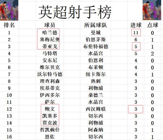射手榜方面,哈兰德11球领跑,在和姆巴佩的隔空较量中,哈兰德还是稍占上风。塞梅尼奥6球排在第2,蒂亚戈今天错失很多机会只打入1球,追上马特塔,5球并列第3。鲍文今天无力进球,还是和埃基蒂克,贾克波,恩佐,哲凯赖什等人3球刚好挤入前十。