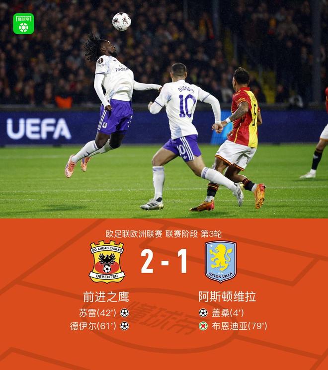 北京时间10月24日欧足联欧洲联赛 联赛阶段 第3轮,前进之鹰对阵阿斯顿维拉。上半场盖桑开场闪击,半场尾声特维特开出任意球,苏雷折射破门扳平比分。下半场约里斯-克拉默助攻德伊尔破门反超比分,之后布恩迪亚将点球踢飞。最终维拉客场1-2不敌前进之鹰。
