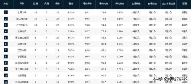 第一档球队当中,除了北京主场不敌山东,输掉了三场比赛外。剩下三支球队都是10胜2负。