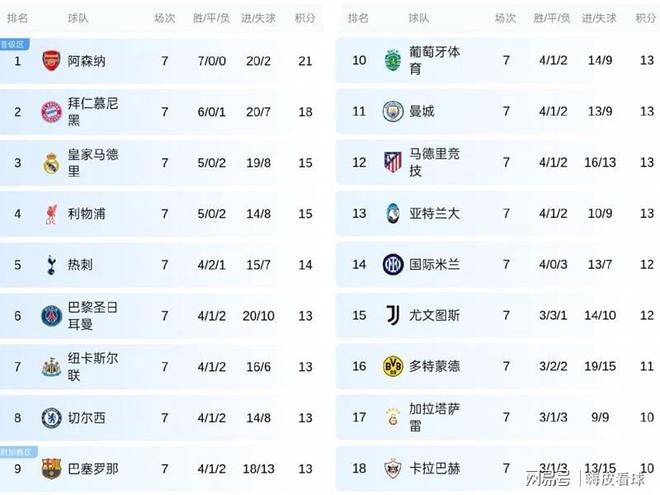 不难看出,如果只计算积分的话,英超6支球队都挤进前八名,整体强势可见一斑。除了英超6队之外,能够拿到13分的,只有“皇萨仁”三强,卫冕冠军巴黎圣日耳曼,加上葡萄牙体育、马德里竞技和亚特兰大,“合围”英超之势已经确立。